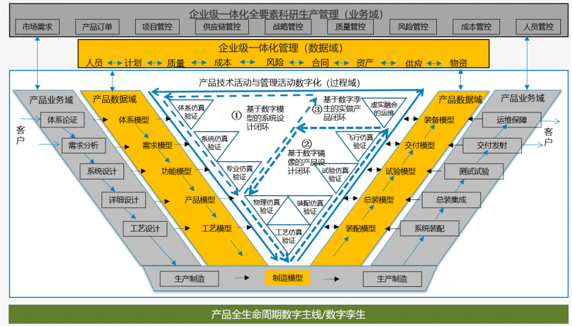 綜上分析,我們認(rèn)為:新一代PLM系統(tǒng)是運(yùn)用先進(jìn)的數(shù)字化理念、工具和技術(shù),以相關(guān)利益方(含客戶、企業(yè)內(nèi)部、合作伙伴等)協(xié)同論證、創(chuàng)建和使用產(chǎn)品資產(chǎn)為基本目的,以產(chǎn)品全生命周期的權(quán)威數(shù)據(jù)源管理為主線,構(gòu)建產(chǎn)品的數(shù)字空間,開展模型數(shù)據(jù)驅(qū)動(dòng)的規(guī)劃論證、研發(fā)設(shè)計(jì)、生產(chǎn)制造、試驗(yàn)測(cè)試、運(yùn)用保障活動(dòng),以及科研生產(chǎn)管理活動(dòng),形成客戶需求快速對(duì)接、工業(yè)部門按需研制、合作伙伴有序配套的體系性協(xié)同環(huán)境,支撐企業(yè)產(chǎn)品全生命周期的業(yè)務(wù)賦能與流程再造,以及業(yè)務(wù)的重構(gòu)和優(yōu)化,助力企業(yè)研制范式變革和業(yè)務(wù)轉(zhuǎn)型。