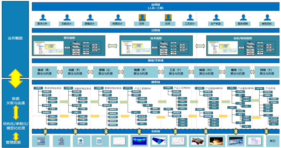 從以文檔為中心向模型數(shù)據(jù)驅(qū)動(dòng)的研制模式轉(zhuǎn)型,重點(diǎn)是構(gòu)建實(shí)物產(chǎn)品的數(shù)字產(chǎn)品空間。利用產(chǎn)品數(shù)字化、過程數(shù)字化、規(guī)則數(shù)字化技術(shù),形成產(chǎn)品數(shù)據(jù)域、過程域和業(yè)務(wù)域的融合,支持全生命周期模型體系管理,以及全生命周期技術(shù)和管理活動(dòng),逐步形成模型數(shù)據(jù)驅(qū)動(dòng)的數(shù)字化研制過程。PLM作為管理產(chǎn)品所有資產(chǎn)并有效協(xié)同各利益方的基礎(chǔ)系統(tǒng),是研制模式變革的直接支撐。
